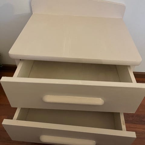 Mustaksi maalattu kokopuinen yöpöytä.Yksi vetolaatikko ja hylly,melko painava.