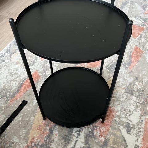 Pieni pöytä metallia, kansi irtoaa. Pinnassa käytön jälkiä kukkaruukusta ym mutta esim maalaamalla saa hyvän . Halk. 44 cm.