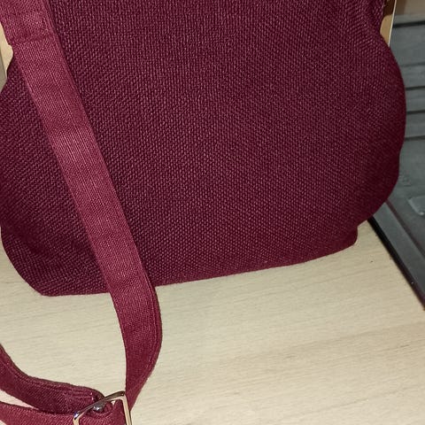 Myydään vahvasta sisustuskankaasta tehty pussukkalaukku jossa erillinen vuori ja välissä silitetty vanu, säädettävä paksu hihna (samasta kankaasta tehty kuin laukku) maksimipituus 133 cm. Sangan leveys 21 cm. Laukun korkeus 21 cm.