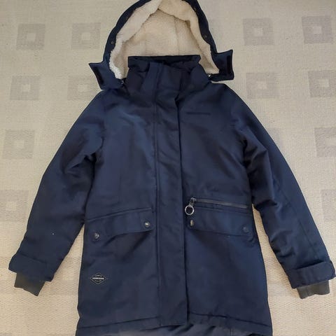 Takin hyvät ominaisuudet: heijastavia haituvia karvakaulushupussa turvallisuuden vuoksi, suojatut vetoketjut, korkea kaulus suojaamaan tuulelta ja "kämmensormikkaat" käsiaukoissa.