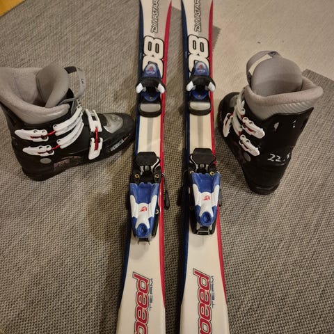 Lasten laskettelusukset, pituus 107 cm ja laskettelumonot, koko n.34, (220-225).