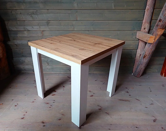 Tukeva ja kivassa kunnossa. Pöydän pintaa on fiksattu ja se on hiukan karhea. Pari kirjavaa kohtaa kulmissa. Reunoissa on jotain pientä jälkeä. Jatkopala vaaleampi ja siinä on selkeästi sileämpi alkuperäinen pinta.