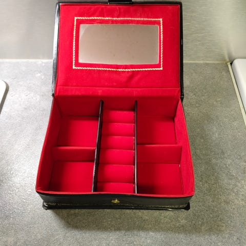 Runko puuta tai vaneria, päällys luultavasti nahkajäljitelmää, sisusta kangasta