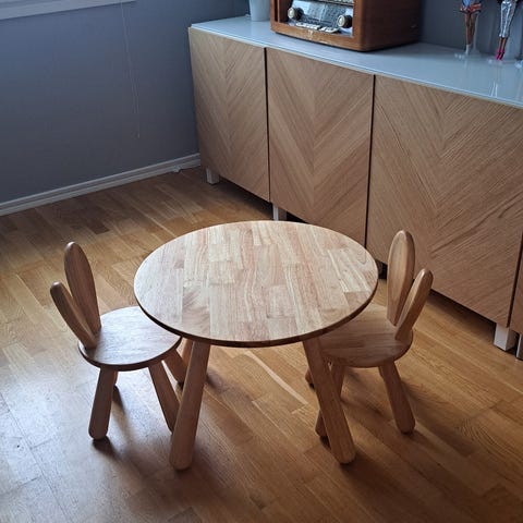 Myydään Minituden tyylikkäät täyspuiset lastenhuoneen pöytä ja kaksi tuolia, joiden selkänojat muistuttavat pupun korvia ja poron sarvia. Sopivat hyvin arkarteluun ja piirtämiseen/ leikkimiseen. Suositusikä 3+ vuotta. Kalusteet valkoiseksi maalattua 100% puuta. Uutena ostettu. Pieniä käytönjälkiä pöydän pinnassa ja porotuolin istuinosassa. Puputuolin toisessa ’korvassa’ särö. Ks. kuvat. Nämä eivät vaikuta kalusteiden käyttöön ja on huomioitu hinnassa.