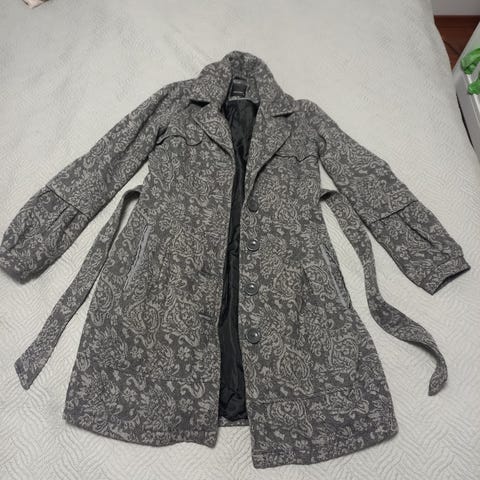 Your face sininen villakangastakki, piilonepit ja vyö. Vasemman hihan vuorikankaan saumassa repeämä kainalon kohdalla