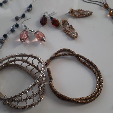 Myydään settinä viisi erilaista kaulakorua ja 12 eriväristä, metallista rannerengasta. Yhteishinta kaikista 8 €.