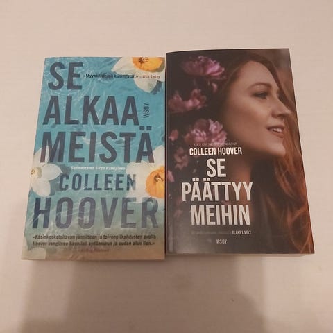 Colleen Hooverin kirjat 'Se alkaa meistä' ja 'Se päättyy meihin' ovat suomenkielisiä painoksia. Kirjat ovat pehmeäkantisia ja sisältävät romanttisen tarinan. Ne sopivat lukijoille, jotka ovat kiinnostuneita nykykirjallisuudesta ja kaunokirjallisuudesta.