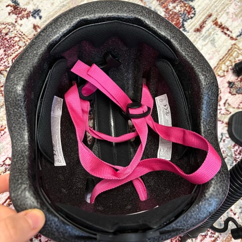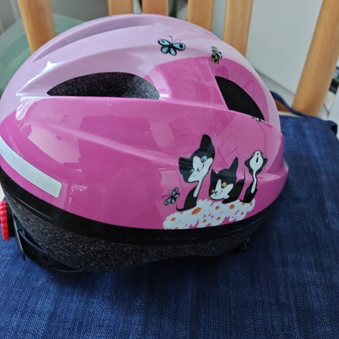 Lasten kypärä, väriltään pinkki, suunniteltu tarjoamaan suojaa ja mukavuutta lapsille pyöräilyssä tai muissa ulkoilulajeissa. Kypärässä on säädettävät remmit ja useita ilmanvaihtoaukkoja. Kunto kohtalainen, pinnassa naarmuja. Toimiva ja ehjä.