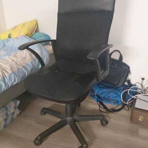 Myydään musta keinonahkainen työtuoli, säädettävä korkeus ja kallistus. Pyörät alla. Selkänojan takaosa osittain kangasta. Siisti yleisilmeltään.