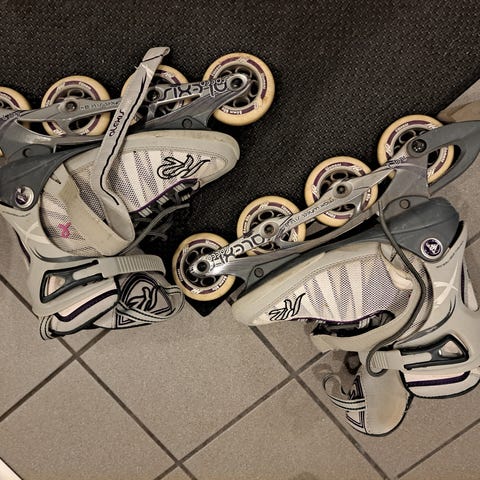 Annetaan Niken rullaluistimet, koko 39. Paljon käytetty: toisen luistimen sisäreunassa on reikä (näkyy kuvassa) ja jarrupala on kulunut (kolmas kuva). Mukaan saa myös Salomonin rannesuojat. Nopeimmalle noutajalle.