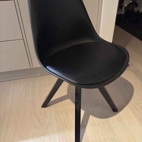 Myynnissä kaksi Askon Logan-ruokatuolia joiden istuinosat ovat mustat ja jalat puuta.
