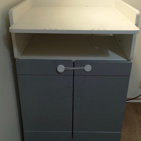 Hoitopöytä on muunneltavissa työpöydäksi, kun hoitotason laskee alas.