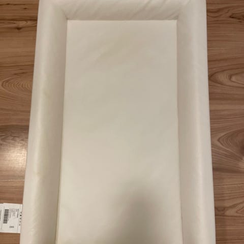 IKEA lastenhoitopöytä, valkoinen. Pöydässä on kolme laatikkoa ja avohyllytilaa.