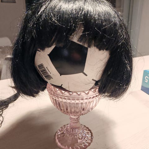 Musta lyhyt peruukki. Uusi suoraan pussista. Koitettu päähän ja todettu liian lyhyeksi