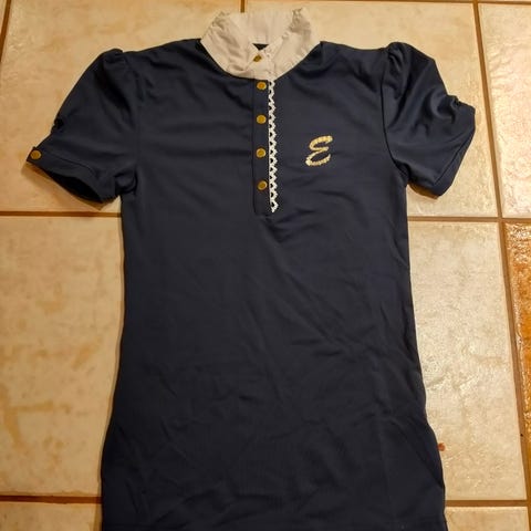 Fair Play naisten lyhythihainen kisa/ ratsastuspaita, tummansininen ihanilla pitsiyksityiskohdilla hihoissa sekä selän yläosassa. Paidassa on koristeelliset yksityiskohdat ja verkkokankaiset osat hihoissa ja selän yläosassa.
