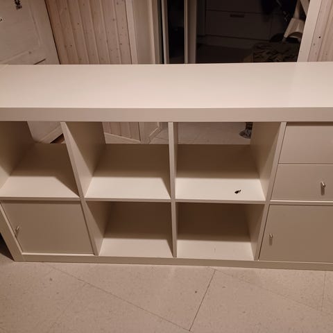 Ikea hyllykkö jossa käytön jälkiä, vähän kynän jälkiä jossakin ( saa varmasti jollain jos kehtaa hinkuttaa ) yhdessä kolossa vitriinikaappi ja yhdessä kaksi pientä vetolaatikkoa. Kangas/ pahvi laatikot saa myös mukaan. Kaapin päälle tullut painauma ( kuva ).