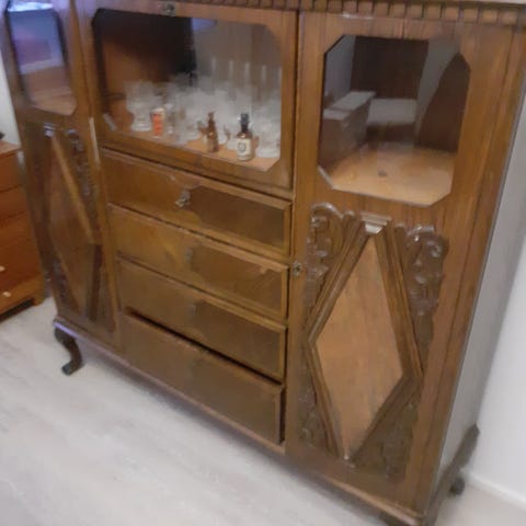 Upea, vanha vintage tammikaappi, jossa keskellä vitriini ja molemmilla sivuilla kaapit, joissa hyllyjä.