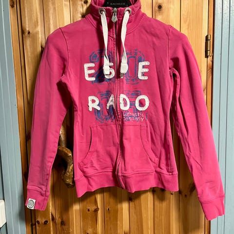 Tummansininen/navy svetari pienillä glitteryksityiskohdilla (hopea) ja kätevillä vetoketjutaskuilla. Ollut ratsastuskäytössä. Pinnassa on hieman pesuhaitua ja resorien väri on vähän kulahtanut, muuten siisti ja täysin ehjä takki. 80 % puuvillaa, 20 polyesteria.