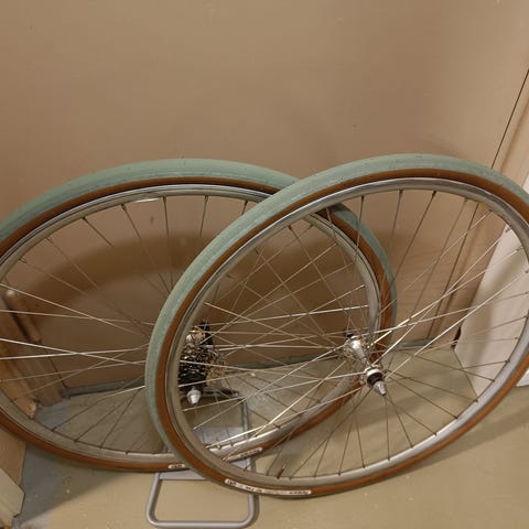 Uudenveroiset 700c-tuubikiekot klassikkopyörään. Navat Shimanon Exage, kehät Rigida Pro. Päällä ajamattomat Spessun S-Works tuubit (todellinen leveys n. 25mm). Teipillä asennetut. Todella hienot kiekot ensi kesän retrokilpuriajoihin.