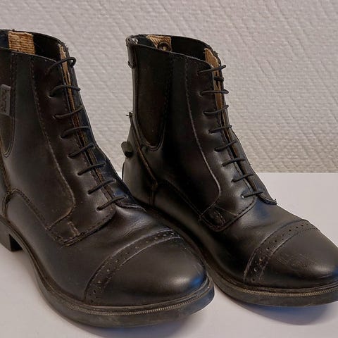 Myydään hyväkuntoiset nahkaiset lasten ratsastuskengät. Kengät ovat nilkkapituiset ja sirot. Pohjat ehjät ja hyväkuntoiset. Takana vetoremmi, joka auttaa kengän pukemista. Koko 33.