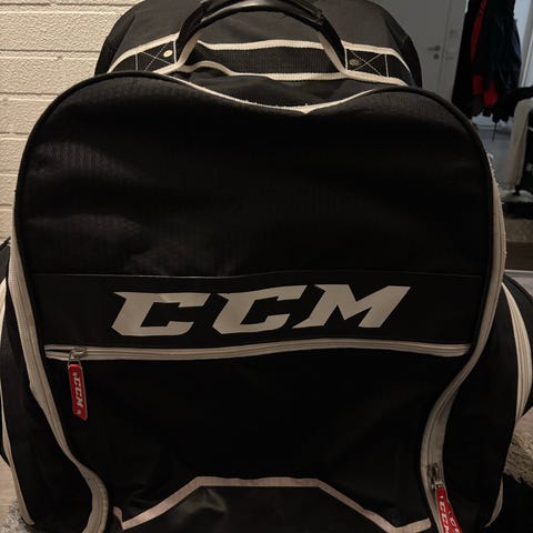 Reppumallinen CCM Jääkiekkokassi sininen väri, varustettu vetokahvalla ja pyörillä. Laukussa useita vetoketjutaskuja ja olkahihnat kantamista varten. Soveltuu jääkiekko- ja urheiluvälineiden kuljetukseen. Toinen luistintaskuista revennyt ja vetokahva ei tule ulos.
