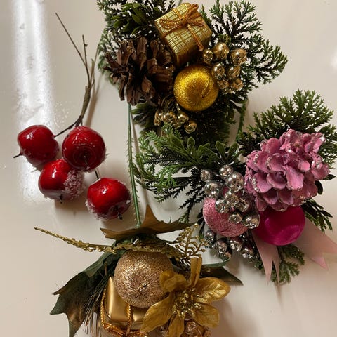 Kuvan juhlakoristeet 6kpl koristerusetteja,4 kullanväristä ja 2 mustaa. Eri kokoisia,käyttämättömiä.