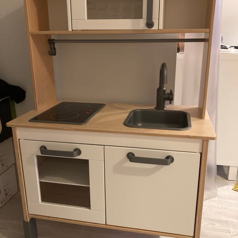 IKEA lasten leikkikeittiö tykötarpeineen. En ala kaikkia kuvaamaan, mutta mukaan tulee iso kasa ruokia yms keittiöleikkiin sopivia juttuja ❤️ tarrat saanee irti tuosta mikron ovesta.