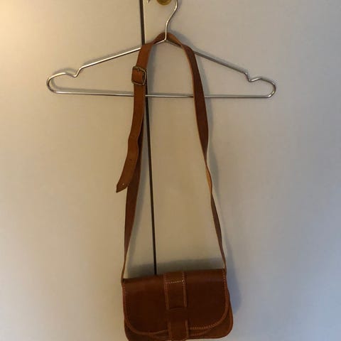 Pieni nahkainen laukku, johon mahtuu esim. kännykkä, avaimet ym. Kangashihna, jonka voi irrottaa ja vaihtaa tarvittaessa. Laukun mitat: korkeus noin 18 cm ja leveys noin 14 cm. Kolme taskua. Myydään Toridiilinä.