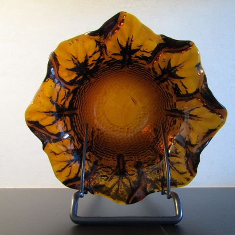 Suunnittelija Pertti Santalahden suunnittelema Humppilan Kasvimaalla pieni kulho, korkeus on 6 cm ja halkaisija 17,5 cm. Kasvimaalla sarjaa valmistettiin 1978 - 1986 vuosien välissä. Tämä kulho oli tuotannossa vuosina 1978 - 1983. Väri kirkas/ruskea ja paino on 565 g. Materiaali on keskipakoisvalettu lasi. Pohjassa on signeeraus Pertti Santalahti Humppila Finland. Humppilan merkki on vielä paikalla.