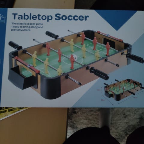 Pöytäjalkapallo uusille kisailijoille. Muutamia kupruja, pari silmiin osuvaa kuvissa. Kevyt. Jalat voi irroittaa.