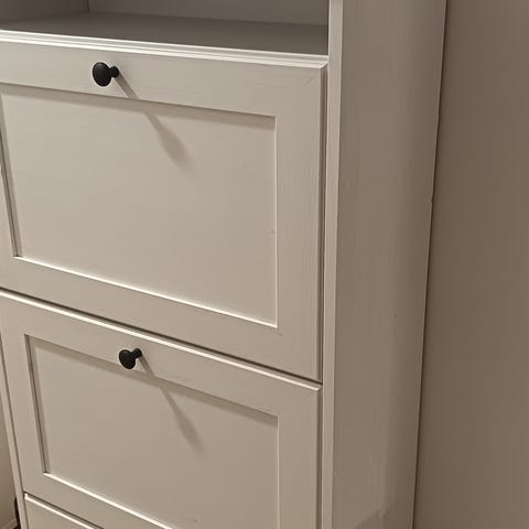 Myydään erinomaisessa kunnossa oleva valkoinen Mackapär kenkäkaappi liukuovilla.