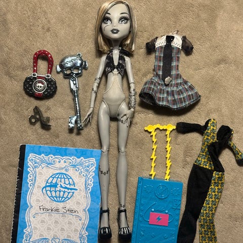 Myydään Monster High Frankie Stein nukke. Mukana kuvassa näkyvät tarvikkeet.