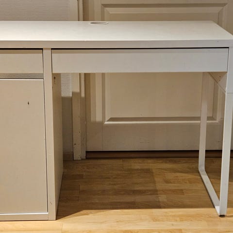 Työpöytä. Leveän laatikon sisällä lokerikko, jonka halutessaan saa kaupan päälle. Pöydän pinnassa hieman kulumajälkiä mutta edelleen mielestäni hyvä lasten kirjoituspöytä.