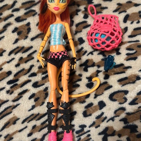 Monster High Ghoul’s Alive Toralei Stripe nukke. Siisti ja hyväkuntoinen. Hiukset vahvasti geelatut ja hieman pölyiset. Alive ominaisuus toimii selässä olevasta vivusta.
