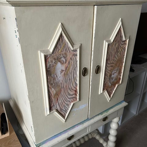 Ollut tv-kaappina. Takaseinässä johdoille pyöreä reikä. Muuten pinnat ehjät. Toki on vanha ja puu elänyt.