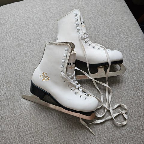 Angel lasten luistimet koko 34, väri valkoinen. Luistimissa pehmeä vuori ja perinteinen nauhakiinnitys.