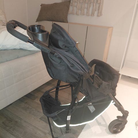 Hyväkuntoinen, helposti kokoontaitettava ja kevyt kantaa. Poistettava etukaari, pehmustetut turvavyöt, jatkettava kuomu. Kevyet työntää, liikkuvat helposti ja vaivattomasti. Painoraja 15kg.