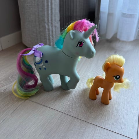 Kuvanmukainen paketti My little ponyja. Talosta on yksi sarana rikki ja poneissa tussin jälkiä (en tiedä lähteekö jollain aineella pois). Timantti silmiä puuttuu. Myydään heikkokuntoisina.