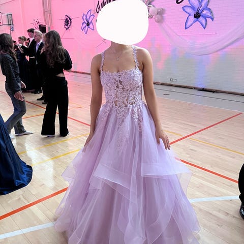 Myydään Wanhoissa kerran käytetty tanssimekko pastellinliilassa värissä. Koko on XS. Olen 163cm pitkä ja minulla oli vannehame alla sekä 3cm korot. Wanhojen mekko ostettu Minna Lisasta Helsingin keskustasta. Selkä on ihanan avoin, ja koska nauhojen tiukkuutta voi säädellä, niin koossa on joustoa. Helmassa on neljä kerrosta kangasta ja yläosassa on kaunista lehtikuviota. Mekko on pysynyt hyvässä kunnossa, mutta sisäpuolella on vähän tahroja itseruskettavasta. Helmassa on pieniä käytön jälkiä, mutta nämä pienet viat eivät näy päälle päin.