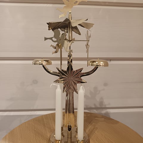 Vanha enkelikello. Kynttiläosissa tummentumaa paljon myös jonkin verran kahdessa enkelissä. Muutoin ehyt ja toimiva