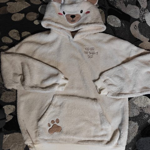 Myydään Neomondo -merkkinen naisten teddy-huppari. Koko L. Edessä ja taskuissa vetoketjut. Väri luonnonvalkoinen.