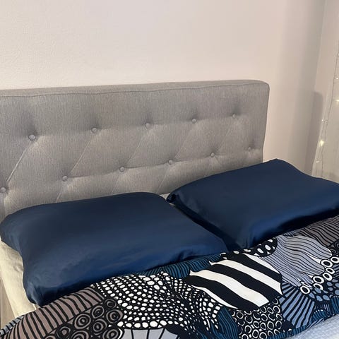 Itse valmistettu pehmustettu vaalea sängynpääty. Korkeus 121 cm, leveys 122 cm (120 cm sängylle), vähintään 40 cm korkealle sängylle. Kankaassa jotain harmaata värjäymää luultavasti hiusväristä, helppo irroittaa ja nitoa uusi kangas tilalle halutessaan. Vain nouto Järvenpäästä.