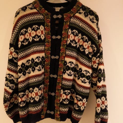 Kauniisti kuvioitu villainen kirjoneuletakki. Edessä koristeelliset hakaset. Erittäin siisti.