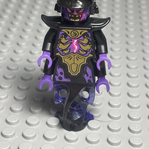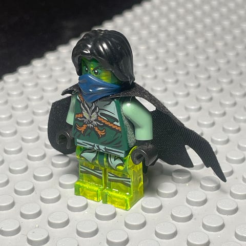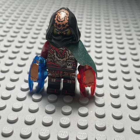 LEGO NINJAGO hahmo, jossa oranssit kädet ja jalat sekä vihreä vartalo ja pää. Hahmolla on myös musta hattu ja yksityiskohtainen kasvojen kuviointi.