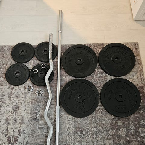 Suora tanko ja 40kg painoja. 2kpl 10kg, 4kpl 5kg, 4kpl 2.5kg painoja. Tanko 30mm halkasija ja paino 10kg. Tangon pituus 179,5cm