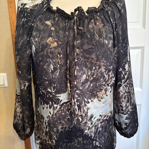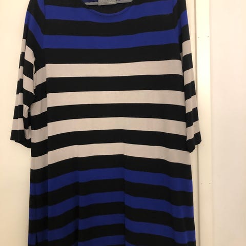 Uudenveroinen, tukevasta kankaasta, jossa joustoa oleva tunika. Ei kulumaa tai tuoksuja. Kerran päällä, mutta itselle sopimaton. Niskassa kolme koriste nappia, jotka avattavia. Vara nappi löytyy myös. Viimeisessä kuvassa. Elastaania mukana, joten joustoa löytyy. Kai-Kai 52, olka-helma 78.
