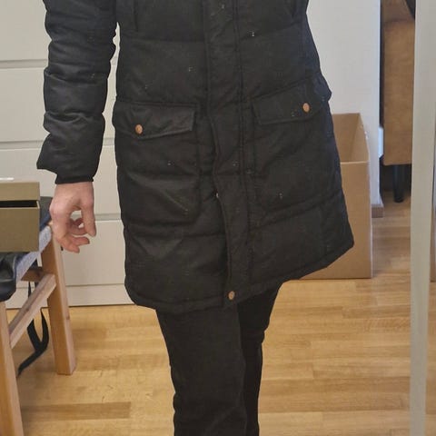 Myydään musta talvitakki koossa 40. Huomasin kuvatessa, että helmassa on pieni viilto kankaassa, muuten takki on siistissä kunnossa.