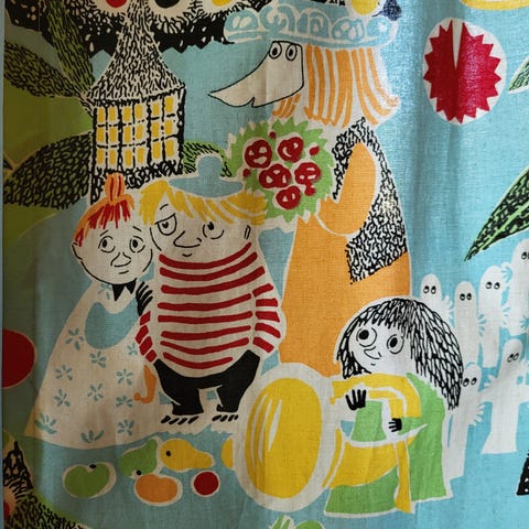 Sarjakuvamainen Muumi sivuverho. Vallilan valmistama. 140x245 cm. KATSO KAIKKI MUUTKIN ILMOITUKSENI