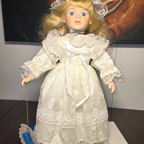 Victoria-A Promenade nukke, joka on puettu pitsiseen valkoiseen mekkoon. Nukella on vaaleat kiharat hiukset ja se on valmistettu keramiikasta tai vastaavasta materiaalista.