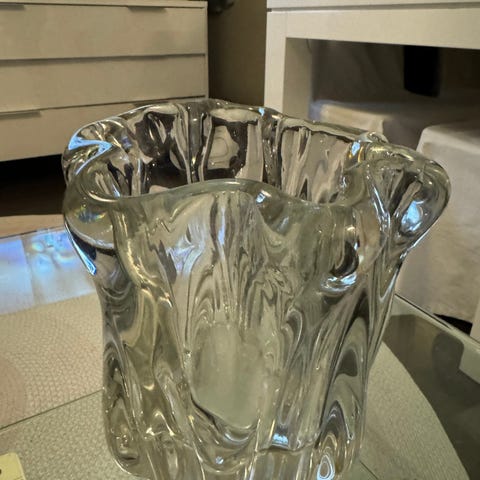 Tapio Wirkkala, maljakko, "Kalvolan kanto 3241", signeerattu Tapio Wirkkala 3241.Kirkasta lasia. Tarramerkitty. Korkeus 12 cm. Halkaisija ehjä muutamia ilmakuplia ja pohjassa siirtely naarmuja hieno desing esine